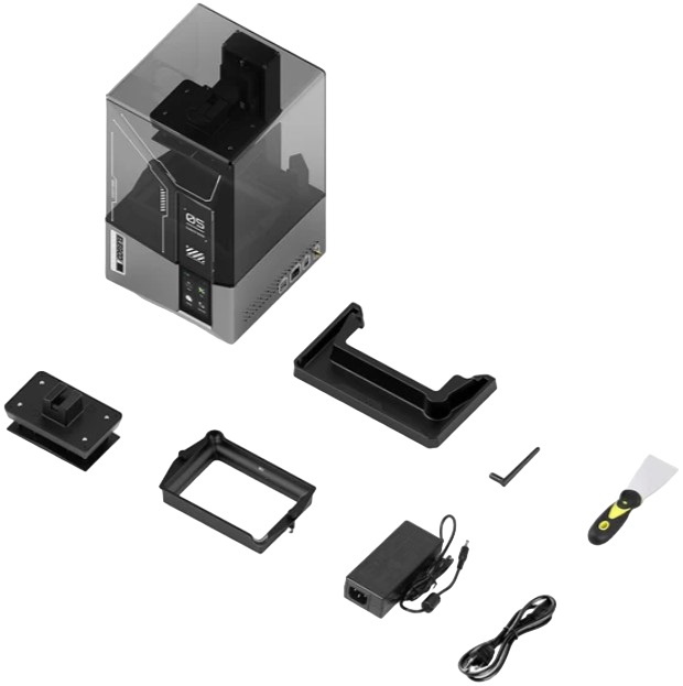 Особенности наборов поставки3D принтер, Wi-Fi антенна, печатная платформа, ванна для фотополимера, ИИ камера, лоток для смолы, USB-flash, защитная маска, перчатки, воронка, крепежные винты, руководство пользователя, адаптер питания, набор инструментов, шпатель.