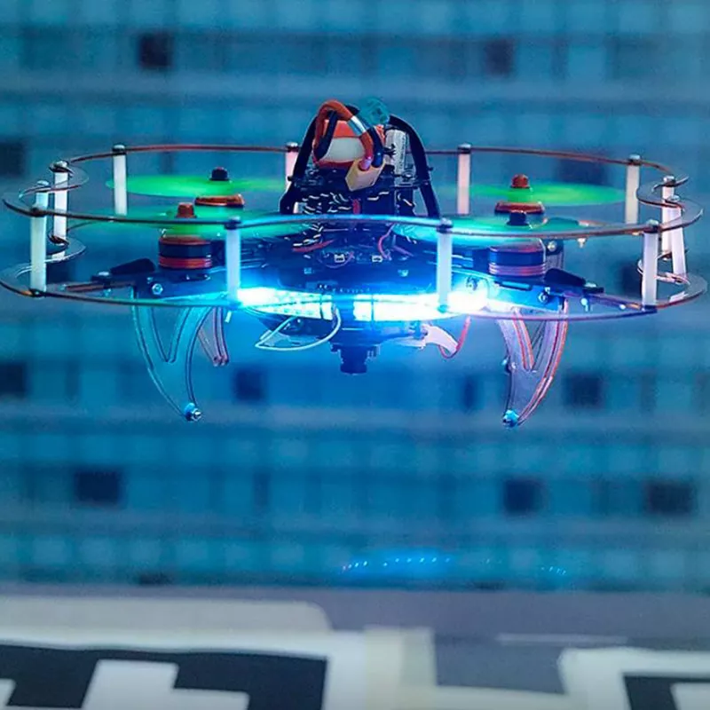 Устройство оснащено программируемой светодиодной лентой для улучшения видимости в воздухе и алгоритмом оптического потока, работающим на raspberry pi 4, который помогает поддерживать позиционирование в помещении.