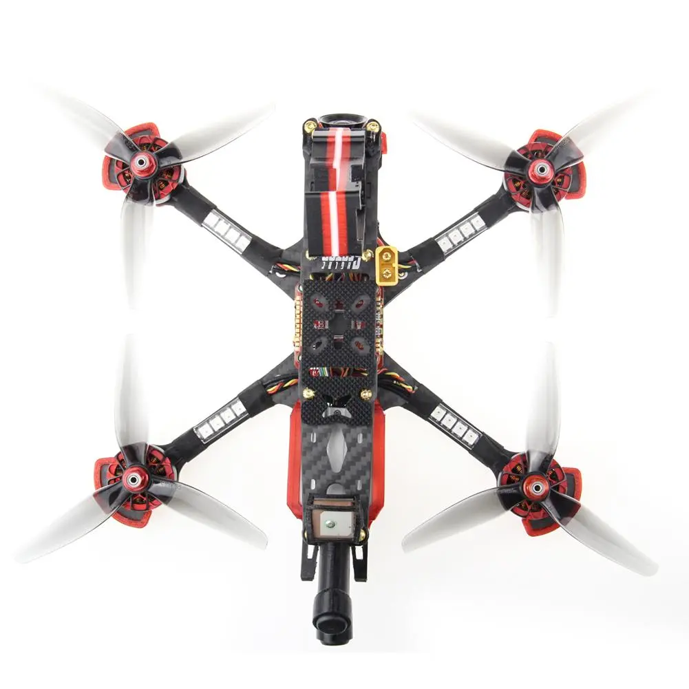 Квадрокоптер имеет компактный размер и весит всего 340 грамм. Корпус сделан из высокопрочного углепластика, который обеспечивает надежную защиту электроники. В конструкции используются высококачественные компоненты, такие как двигатели HGLRC 1404 4500КВ и регулятор скорости HGLRC Zeus F722.