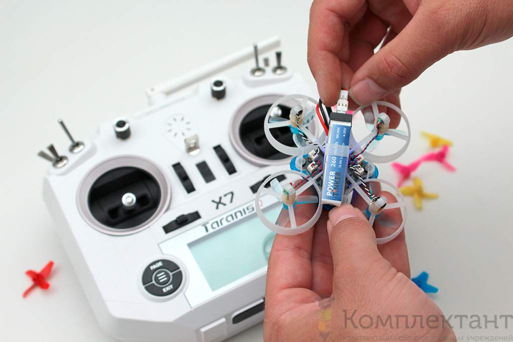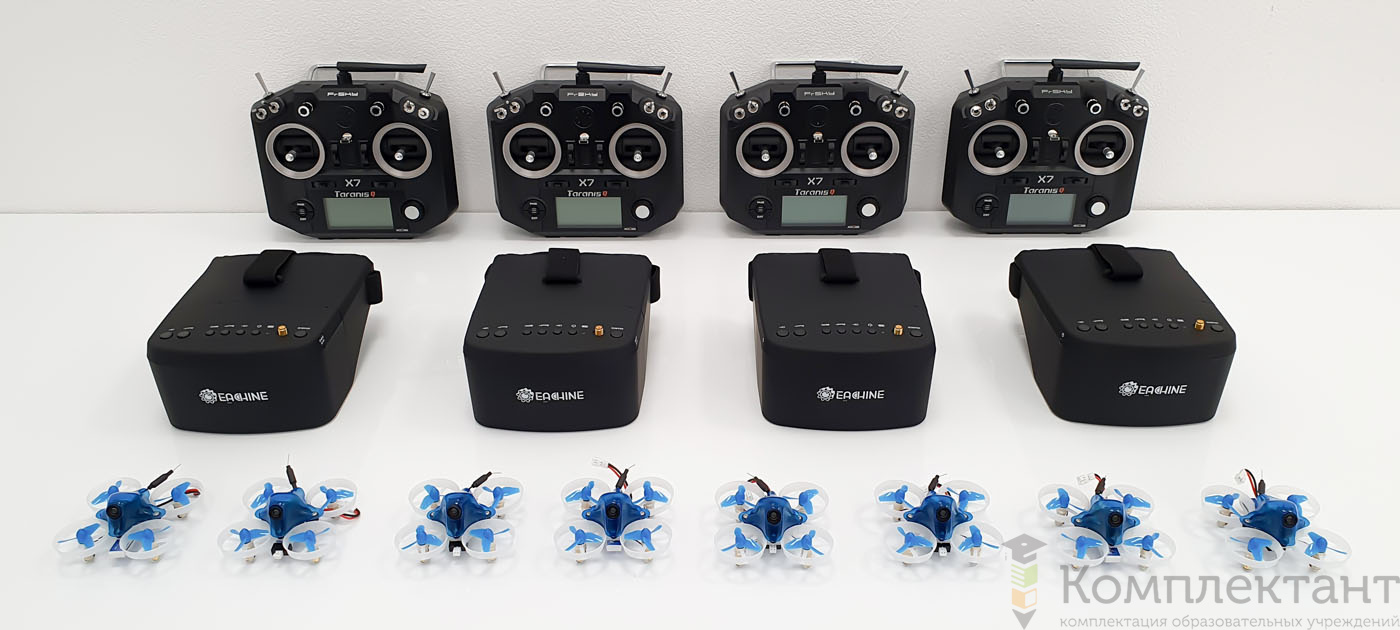 Образовательный набор состоит из восьми готовых к полёту современных мини-дронов, а также комплекта стандартизированных элементов полосы препятствий. Включает электронные версии учебных материалов, набор запчастей, все необходимые инструменты и симулятор для тренировки навыков управления квадрокоптером.