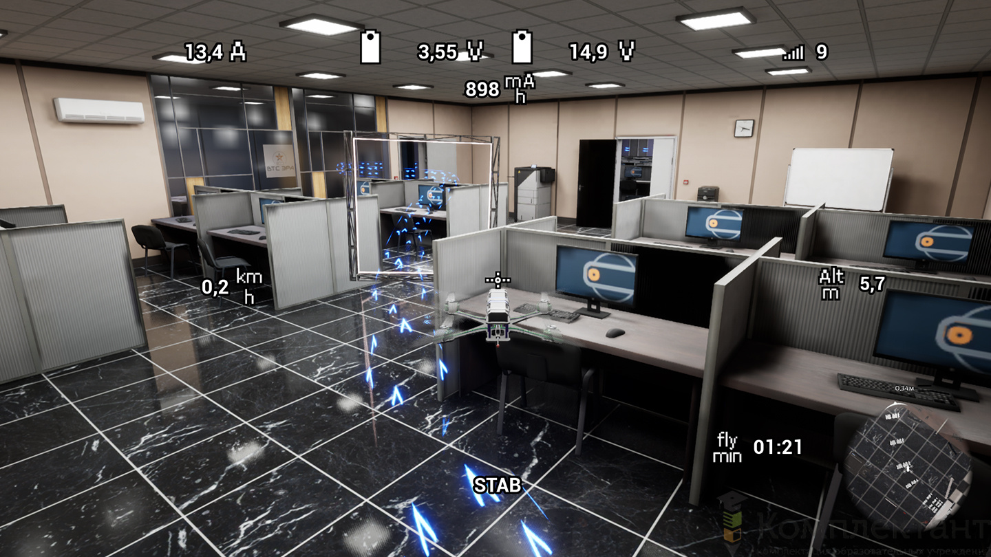 Виртуальный (VR) тренажер «БПЛА квадрокоптерного типа» даёт возможность пользователю освоить технику управления БПЛА, ориентироваться в сложной обстановке, отрабатывать сценарии доставки грузов, маневрирования в различных климатических условиях. Подходит как для индивидуального обучения, так и командных соревнований. Включает 11 тренировочных маршрутов и экзамены для оценки уровня мастерства.