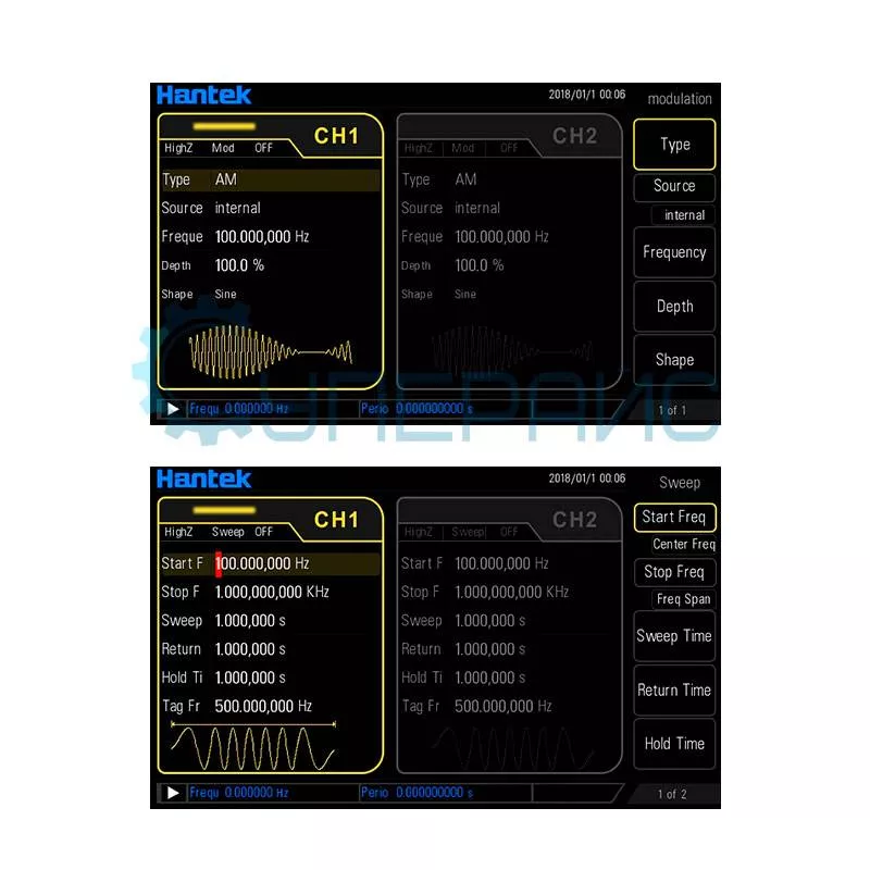 Произвольные формы сигналов | более 160 видов, в том числе Sinc, нарастание/убывание по экспоненте, электрокардиограмма, Гаусса, Haver Sine, Лоренца, тональный сигнал, постоянный ток и т.д. | ||