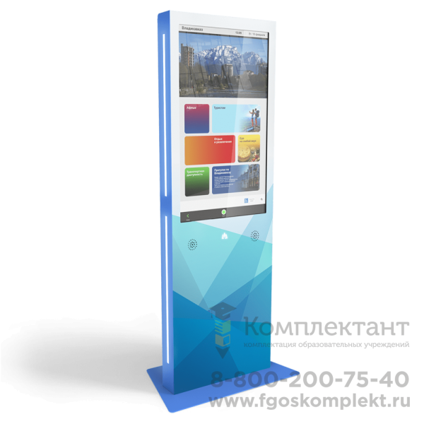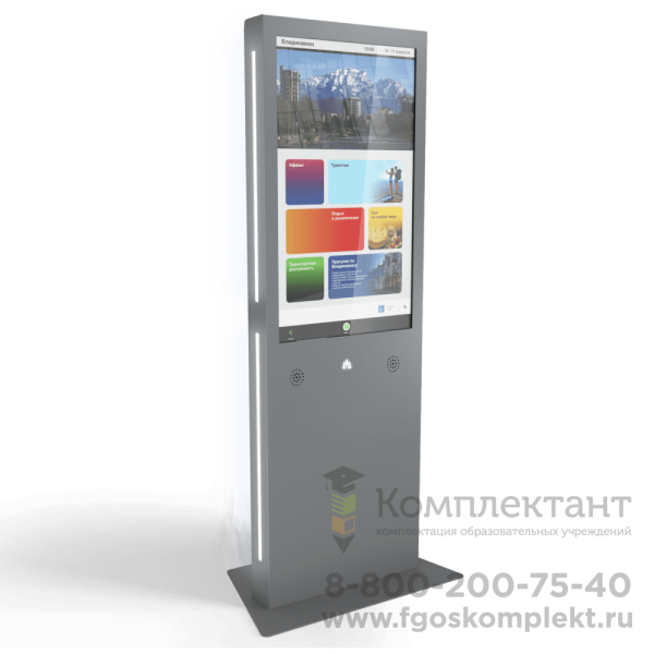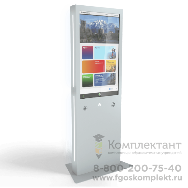 Мультимедийный стенд (стойка) на колесах,  с экраном из закаленного стекла служит для информирования о расписании, новостях школы, и любой другой важной информации.  Также есть возможность демонстрировать фотогаллерею портретов преподавателей, созадавать папки с фотографиями с важных событий, разместить важную информацию в бегущей строке и другие опции. В стоимость входит доставка.