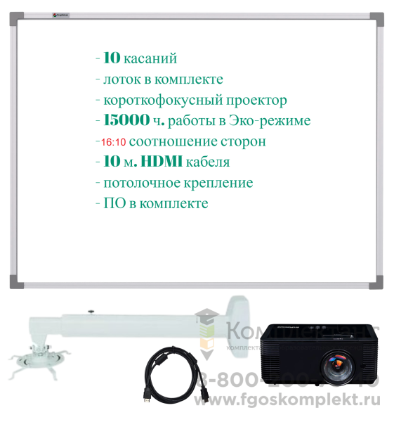 Состав:  Интерактивная доска,  короткофокусный проектор, Потолочное универсальное крепление, Кабель HDMI 10 м. Каждый комплект оснащен бесплатным доступом к шаблонами уроков по алгебре, геомтерии, химии физики.