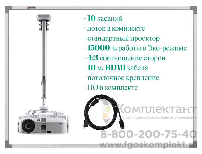 Этот интерактивный комплект даст возможность работать с качественным изображением на интерактивной доске. В комплекте есть все необходимое для установки и работы, кроме компьютера, его вы можете приобрести отдельно, при необходимости.