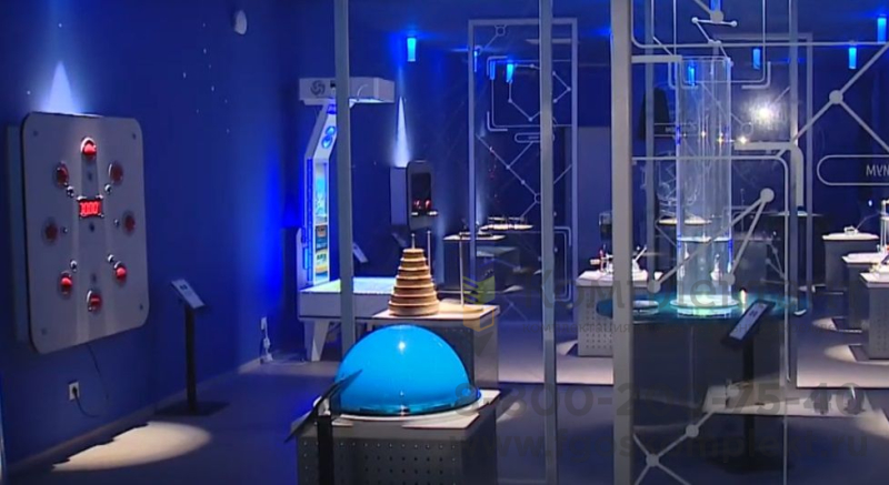 Интерактивный экспонат 9 предназначен для демонстрации и изучения свойств волн и волновых процессов. Посетитель раскачивает аквариум, который установлен на качелях, тем самым создавая волну.