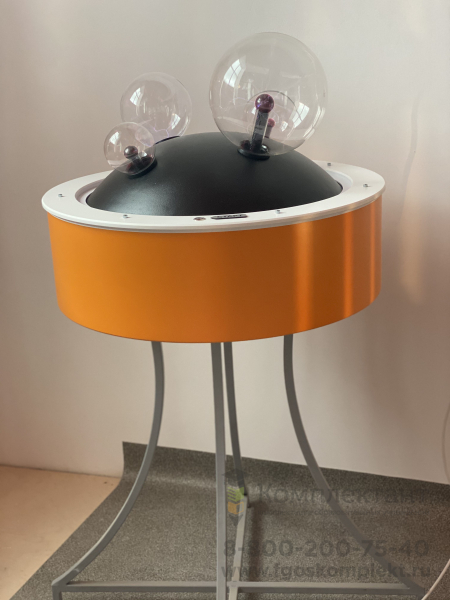 Экспонат 3 предназначен для демонстрации вакуумного СВЧ разряда и представляет собой сферу, наполненную газовой смесью, обеспечивающей цветной разряд (оттенки фиолетового цвета). В нижней части сферы расположен электрод и направлен в центр. Посетитель нажимает кнопку и наблюдает хаотическое движение разряда от центра к стенкам сферы. Затем он прикасается к сфере, происходит изменение направления и интенсивности разряда.
