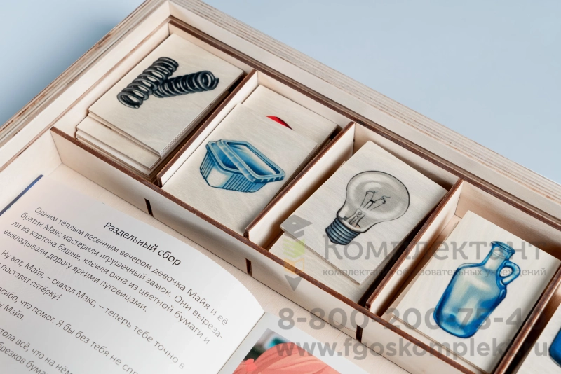 6) Дидактическая игра по сортировке мусора. Комплект контейнеров для сортировки карточек с изображением типов мусора, карточки с изображением мусора – 60 шт.;