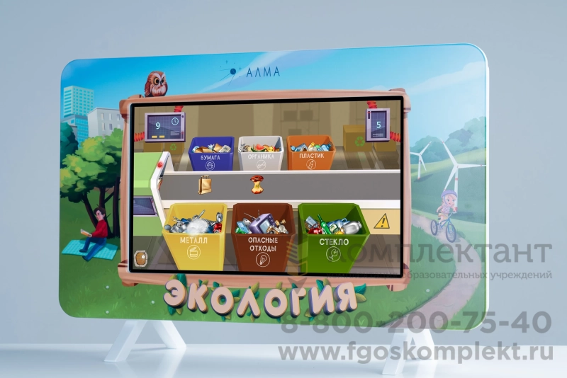 АЛМА «Экология» — это художественно оформленная сенсорная панель с программным обеспечением, а также мотивационные значки АЛМА и дипломы «Юного эколога», сборник экологических авторских сказок, тематические плакаты и комплект деревянных контейнеров и игральных карточек для “сортировки мусора”, карточки для проведения викторины.