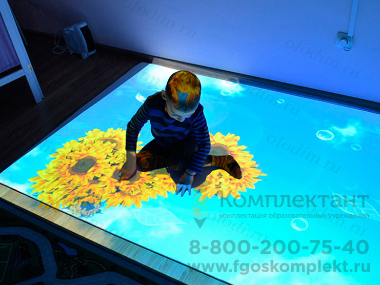 С ним обычный проход по коридору станет для детей увлекательным приключением: он может быть поверхностью океана, в которой плавают рыбки; огромным футбольным полем, на котором можно поиграть с мячом; летним лугом с цветами и бабочками и д.р. – при этом изображение будет моментально реагировать на движение детей.