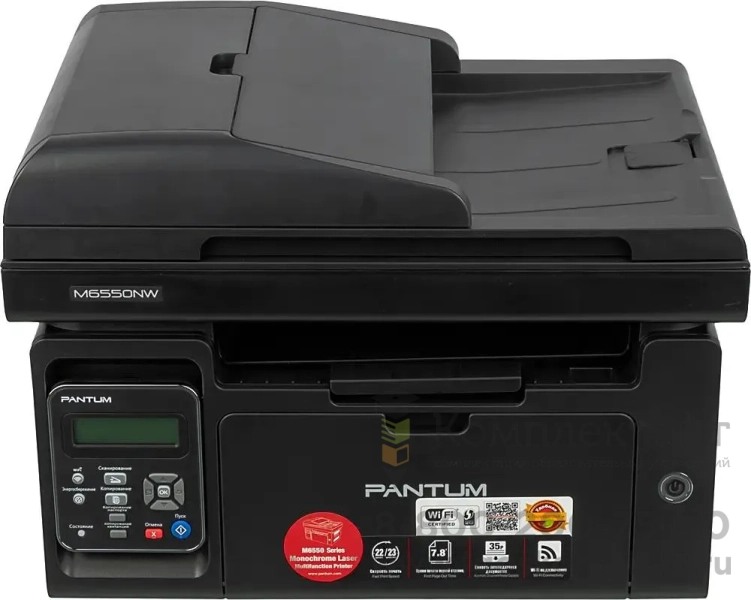 PANTUM M6550NW – компактный черный аппарат прекрасно подойдет для небольшого офиса. Устройство выдает 22 стр./мин чёрно-белой печати в формате А4, это позволяет вести документооборот быстрее. Модель умеет работать с карточками, что очень удобно при производстве визиток.