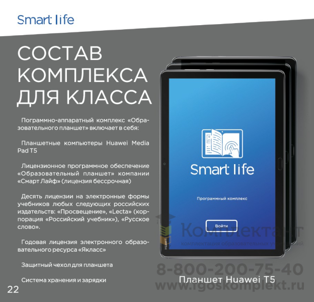 Компьютеры для цифровой библиотеки полностью адаптированы под министерские требования: оснащены обязательными и популярными образовательными программами. Планшетные компьютеры с ПО «Смартлайф» дополнены словарями, калькуляторами, редакторами, прикладными приложениями для обработки текстовых документов, создания графики и презентаций на базе Microsoft. Вместе с планшетами покупатели бесплатно получают ряд дополнительных бонусов: