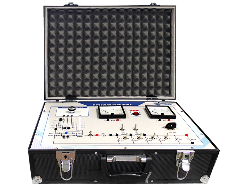 Лабораторный стенд "Промэлектроника" представляет собой кейс, оборудованный трехфазным генератором синусоидальных колебаний частотой 50 Гц с регулировкой амплитуды, неуправляемыми однофазной и трехфазной схемами выпрямления сигнала, схемой фильтра, регулируемой активной нагрузкой и контрольно-измерительными приборами. В комплект поставки входит набор аксессуаров, включащий соединительные провода и сетевой кабель.