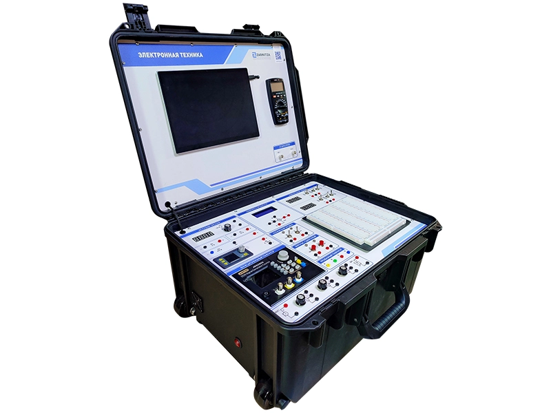 Кейс содержит персональный компьютер планшетного типа с операционной системой Windows, источники питания, цифровые и аналоговые измерительные приборы, функциональный и трехфазный генераторы, макетную плату для беспаечного монтажа, служащую для сборки и исследования схем, и другие функциональные узлы.