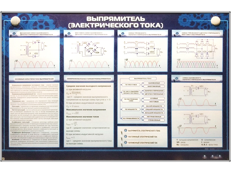 Электрифицированный стенд "Выпрямитель (электрического тока)" представляет собой полноцветную светодинамическую панель, на которой отображена информация о классификации выпрямителей, их основных параметрах. Рассмотрена работа мостовой схемы выпрямления с диаграммами токов и напряжений. Также рассмотрены способы измерения выпрямленного напряжения, графического отображения выпрямителей на схемах.
