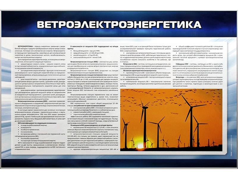 Стенд представляет собой информационную панель, на которой размещена обучающая информация, дающая представление об основных понятиях по теме "Ветроэлектроэнергетика".