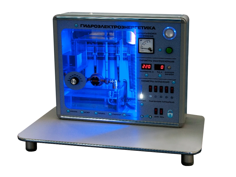 Комплект учебно-лабораторного оборудования представляет собой реалистичную функционирующую модель системы выработки электроэнергии движущимся потоком воды и наглядно демонстрирует принципы работы гидроэлектростанции. Обучающийся может самостоятельно менять скорость и объем протекающей через канал жидкости, исследовать процессы выработки электроэнергии в зависимости от давления водяного столба, объема протекающей жидкости, прослушивать голосовое сопровождение "Виртуального учителя", проводить измерения вырабатываемого напряжения и исследовать процессы потребления электроэнергии. Установка снабжена системой, моделирующей потребление электроэнергии, а также электронным блоком регистрации и индикации электрических процессов. Передняя панель наполовину сделана из прозрачного пластика для обеспечения возможности наблюдения за водяной системой. Вторая половина передней панели содержит органы управления установкой, электрическими цепями и индикации. Взаимодействие обучающегося со стендом осуществляется с помощью интегрированных в переднюю панель высокочувствительных сенсорных датчиков.