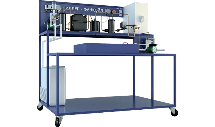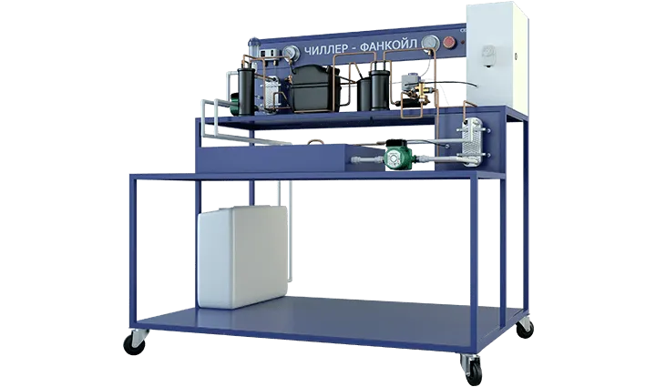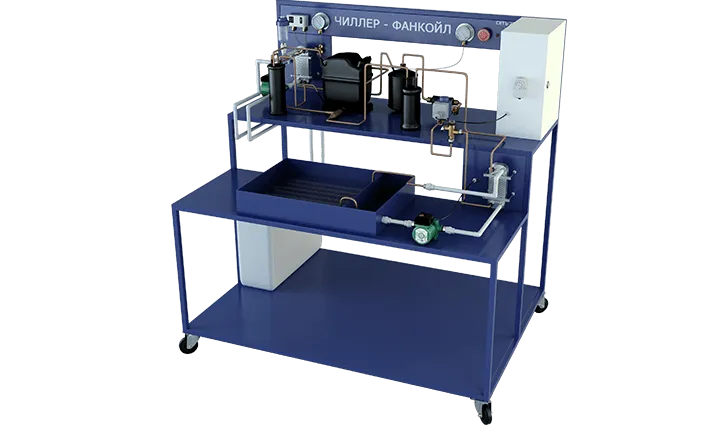 Стенд "Чиллер-фанкойл" демонстрирует работу системы охлаждения воздуха в образовательных учреждениях. Устройство наглядно показывает принцип действия оборудования, упрощая понимание сложных инженерных процессов.
