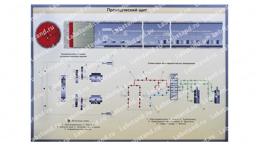 Назначение: стенд-планшет электрифицированный светодинамический предназначен для изучения принципа работы проходческого щита, кинематики движения основных его элементов, принципов действия гидравлических систем горной техники.