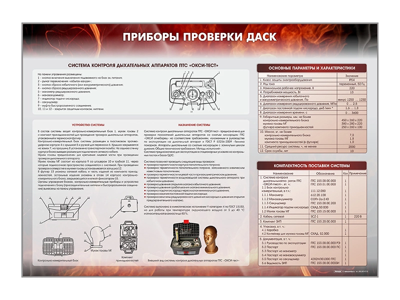 Стенд представляет собой информационную панель, содержащую сведения о внешнем виде, назначении и основных ТТХ приборов проверки ДАСК.