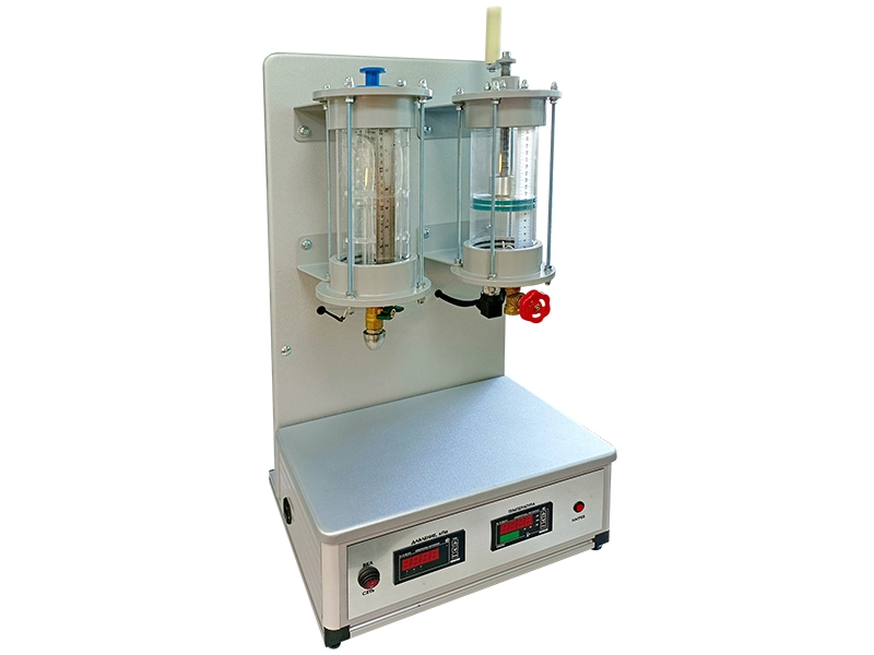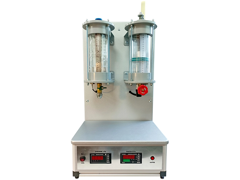 Лабораторный стенд конструктивно состоит из основания, на панели которого расположены органы управления и измерения, и вертикальной панели, где размещены две цилиндрические прозрачные колбы.