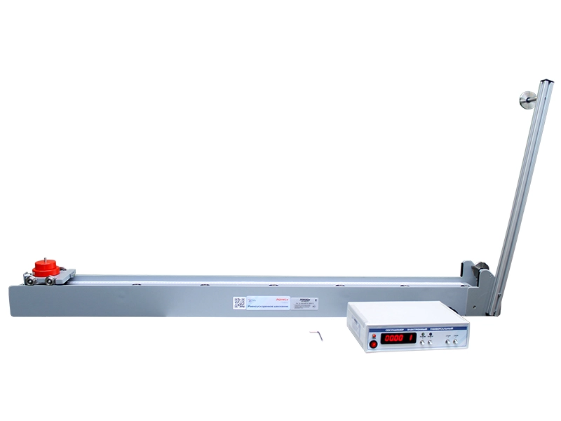 Оборудование конструктивно представляет собой установленную горизонтально дорожку качения, по направляющим которой под действием силы, обусловленной весом прикрепленного на конце перекинутой через шкив бечевки наборного груза, перемещается тележка с грузом. Время, пройденное тележкой с грузом, измеряется с помощью цифрового секундомера в момент пересечения меткой груза луча датчика.