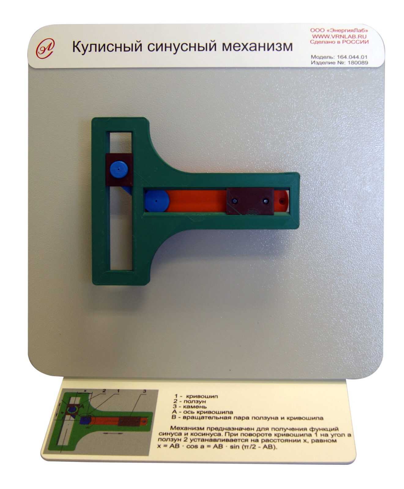 Модель действующего кулисного синусного механизма предназначена для демонстрации получения с помощью данного механизма функции синуса и косинуса.
