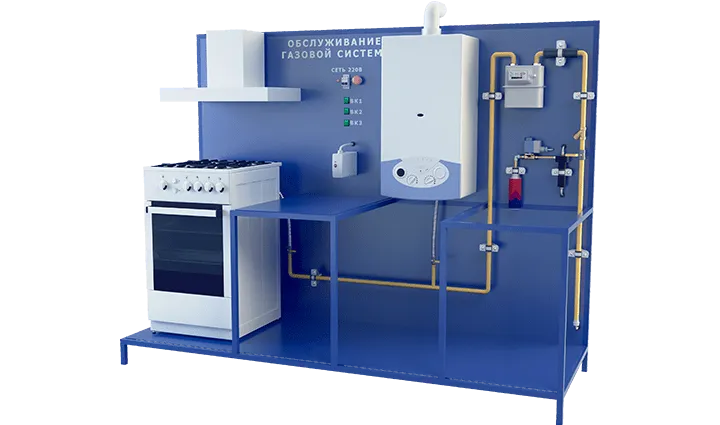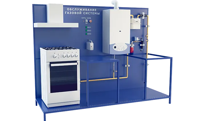 Учебный стенд по обслуживанию газовой системы на 2 потребителя: плита (с вытяжкой) и котел. Изучайте принципы работы газовых приборов, диагностируйте неисправности и проводите безопасное обслуживание.