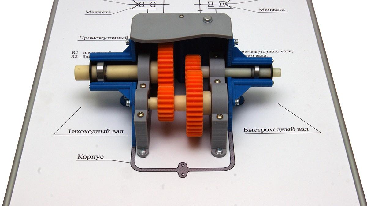 Демонстрационная модель позволяет изучать принцип действия и устройства цилиндрического редуктора, измерять геометрические параметры зацепления, определять передаточное отношение.