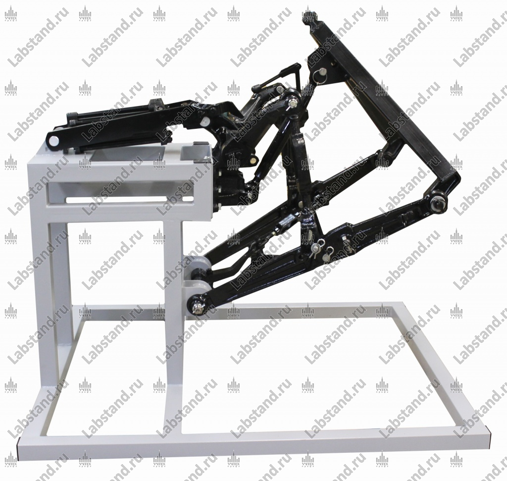 Описание: Стенд-тренажер представляет собой полнокомплектный механизм навески трактора МТЗ-80, адаптированный для учебного процесса. В целях обеспечения наглядной демонстрации, механизм навески установлен на металлическом основании.