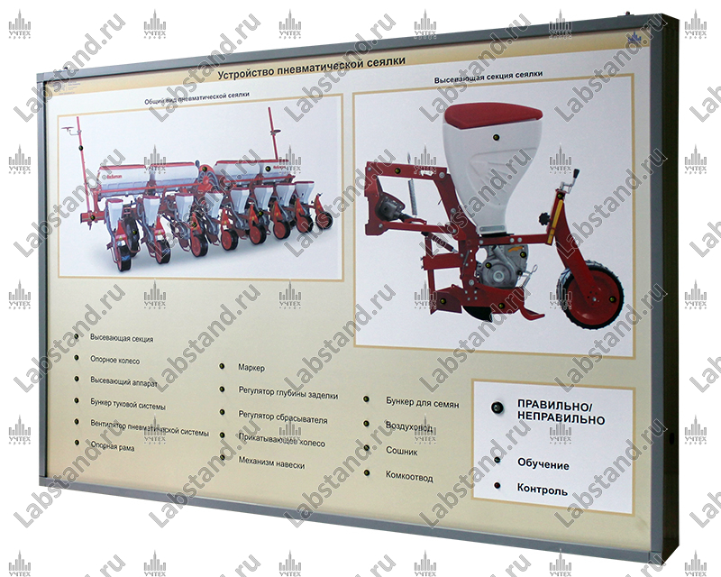 Назначение: Стенд-планшет предназначен для изучения принципа действия приборов и составных элементов пневматической сеялки в учебном курсе ««Посевные машины»».
