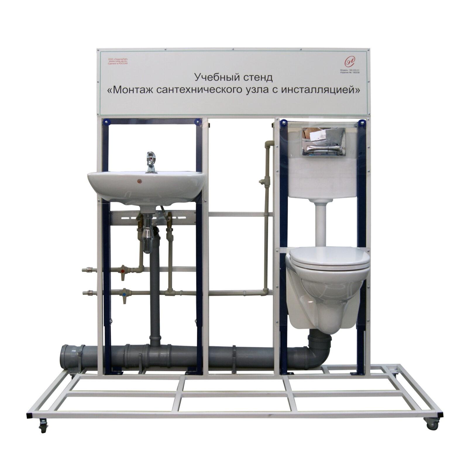 Лабораторный стенд «Монтаж сантехнического узла с инсталляцией» предназначен для проведения лабораторных и практических работ по изучению основного принципа установки инсталляции, установки сливного бака, монтаж чаши унитаза, монтаж сливной системы, монтаж инсталляция для раковины и включает оборудование, которое необходимо для проведения монтажных работ.