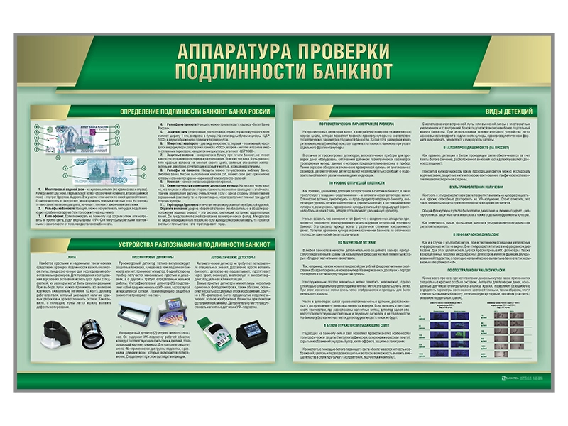 Стенд представляет собой полноцветную панель, на которой изображена аппаратура для проверки подлинности банкнот с техническими характеристиками.