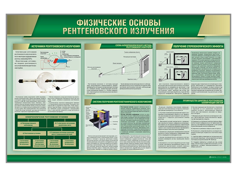 Стенд представляет собой полноцветную панель, на которой представлены физические основы рентгеновского излучения и его применение в досмотровой технике.