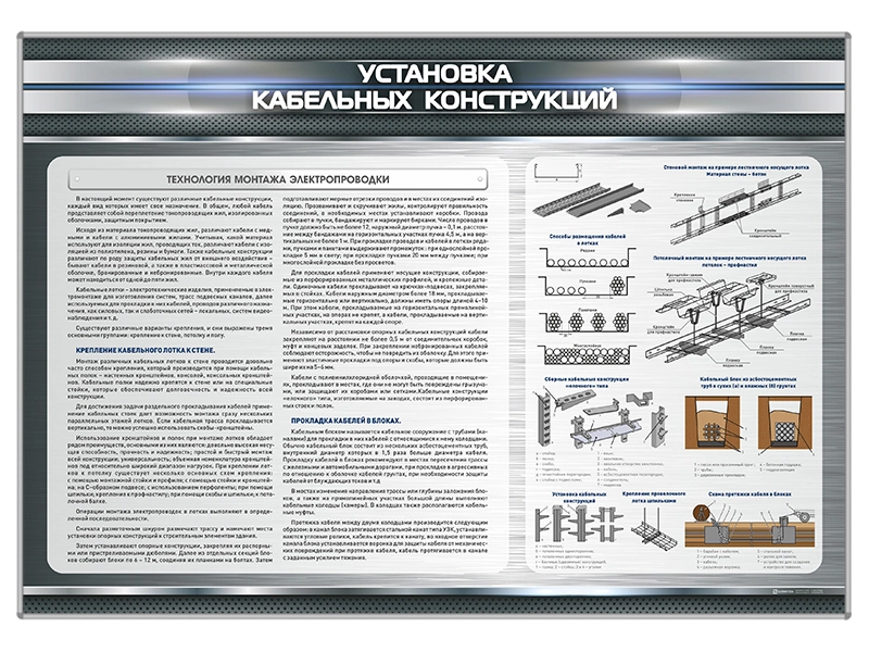 Стенд представляет собой информационную панель, на которой размещена иллюстрированная информация о видах (настенных, потолочных и блочных) и технологии монтажа кабельных конструкций