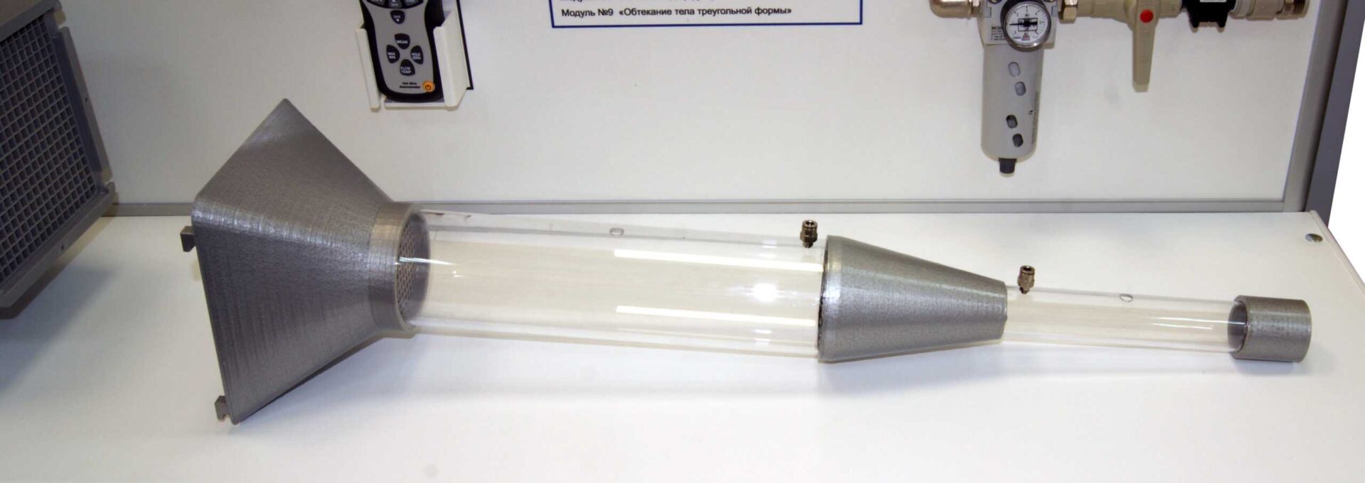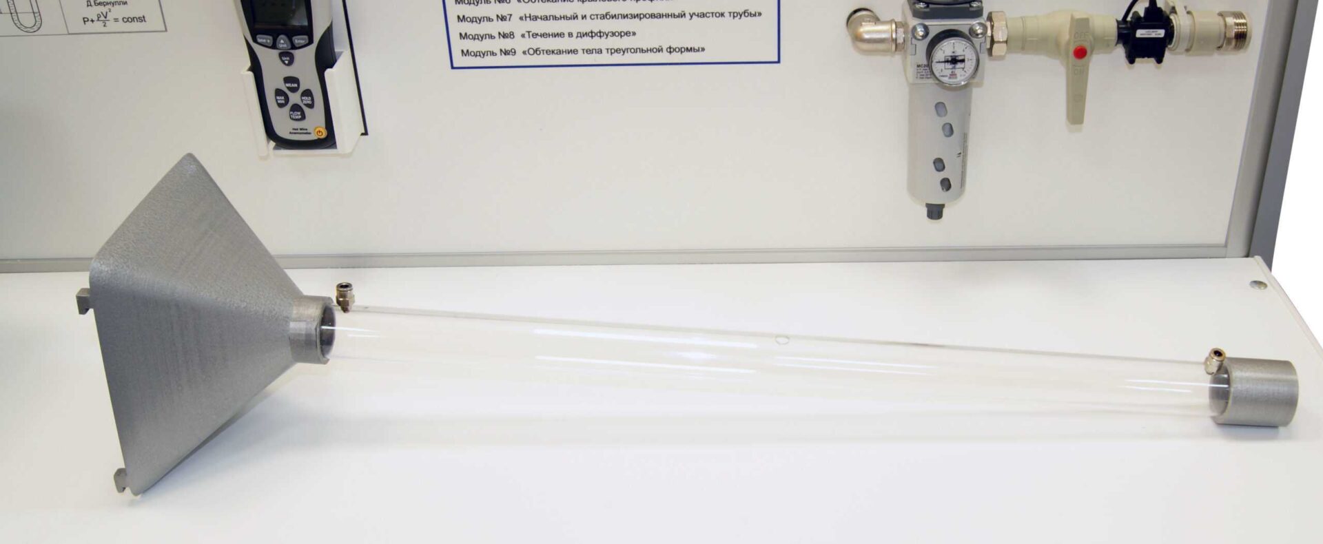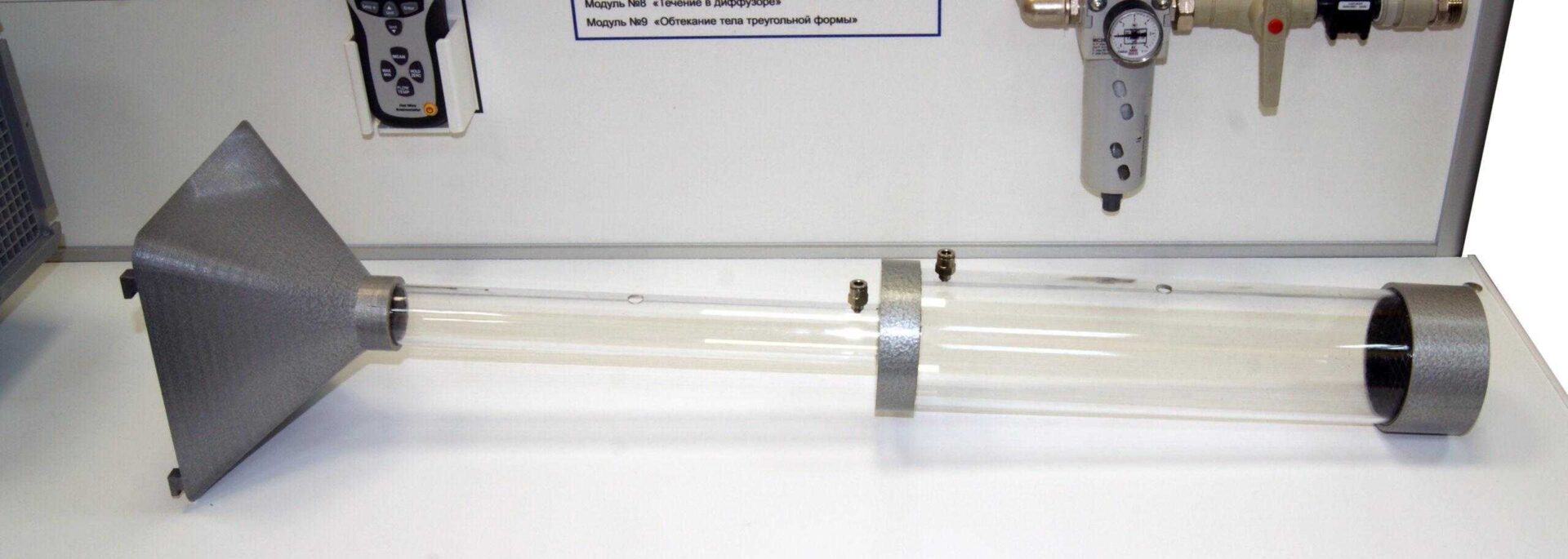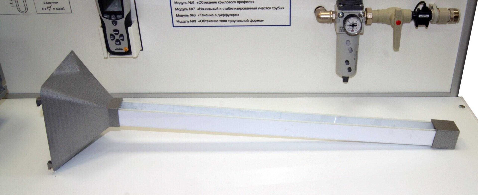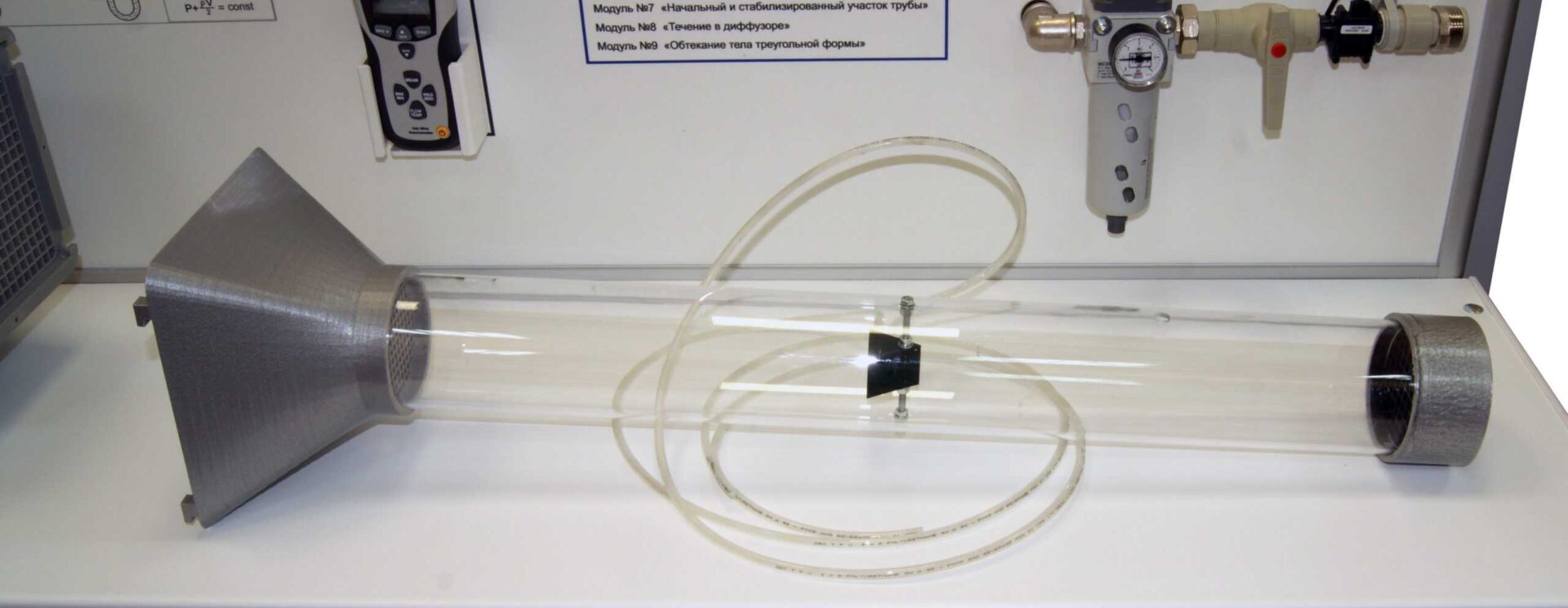 Модуль № 9 «Обтекание тела треугольной формы». Модуль выполнен из прозрачной полиметилметакрилатной трубы, в которой расположены 2 точки для подключения приборов измерения давления.