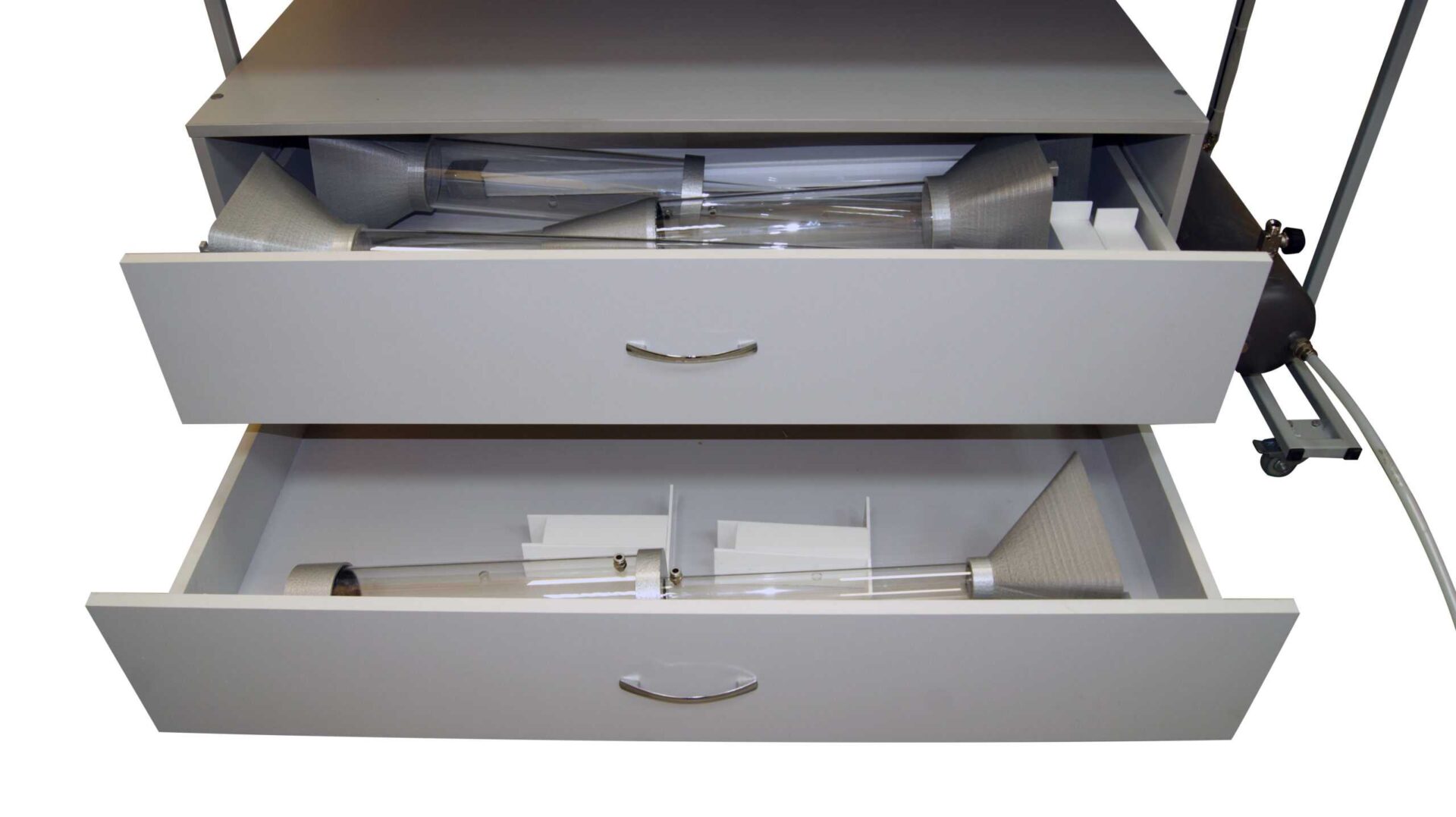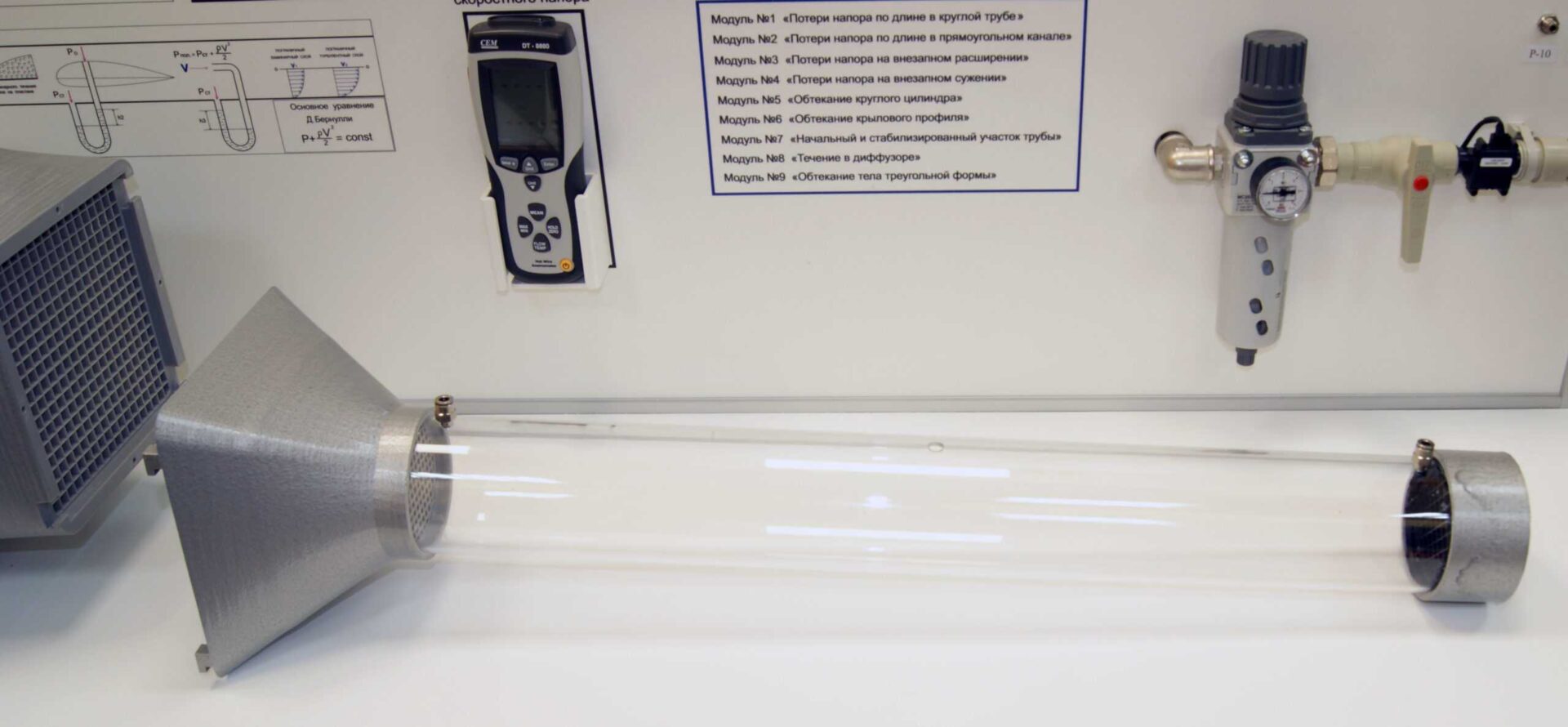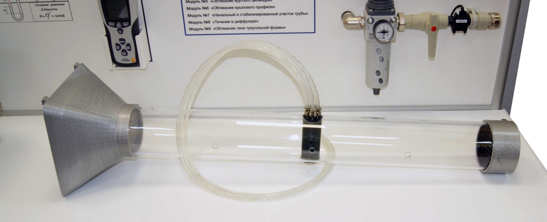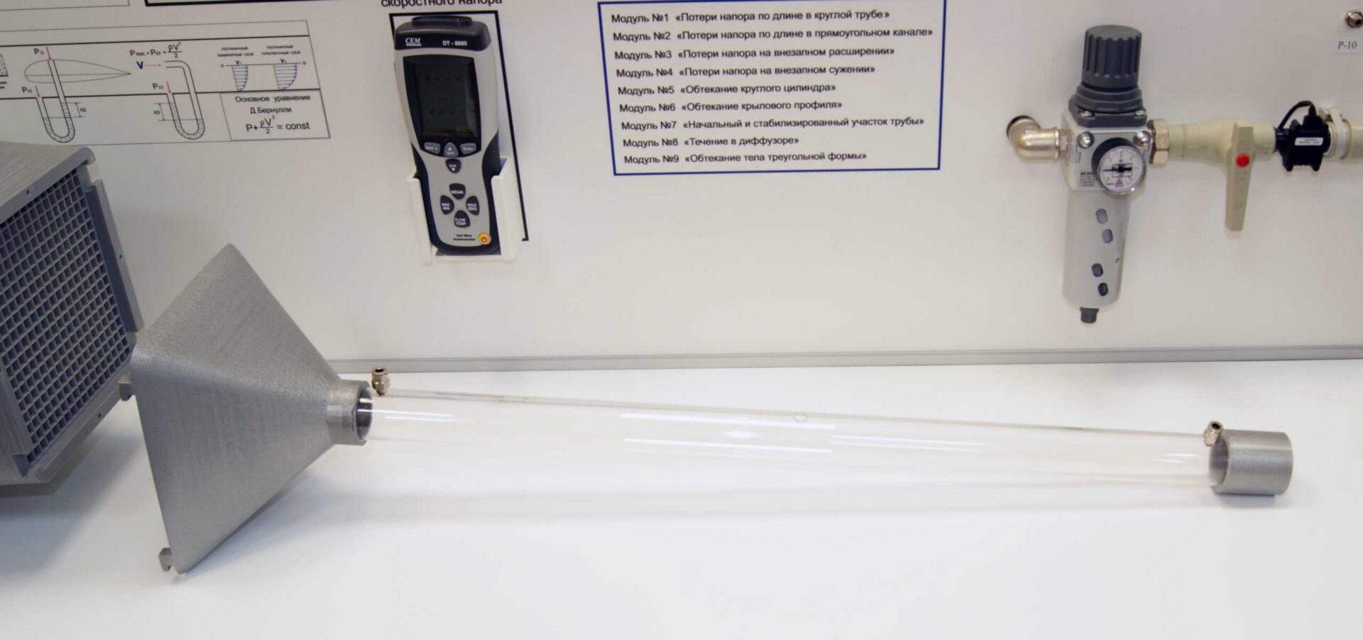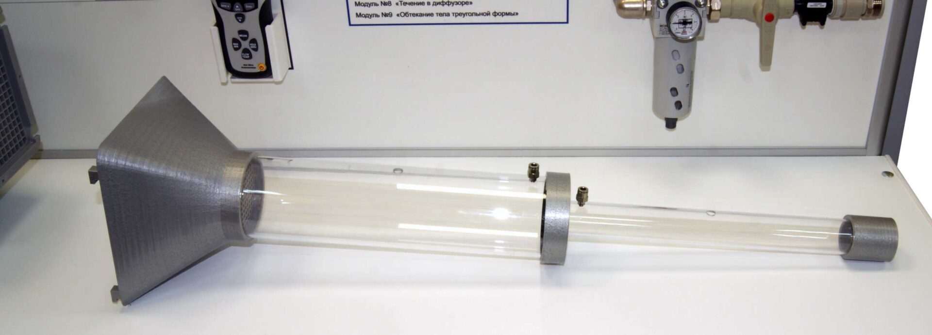 Модуль № 8 «Течение в диффузоре». Модуль выполнен из круглой прозрачной полиметилметакрилатной трубы, в которой расположены 4 точки для подключения приборов измерения давления;
