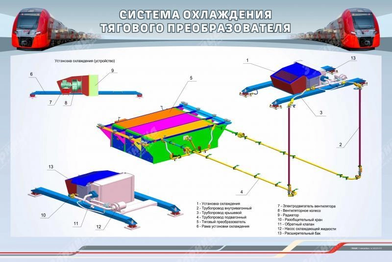 Стенд представляет собой полноцветную панель, на которой размещена информация по системе охлаждения тягового преобразователя.