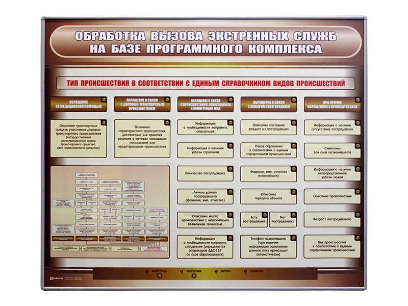 Интерактивный стенд-тренажер представляет собой информационную панель с раздельной секционной световой индикацией, на которой изображена схема обработки вызова экстренных служб.