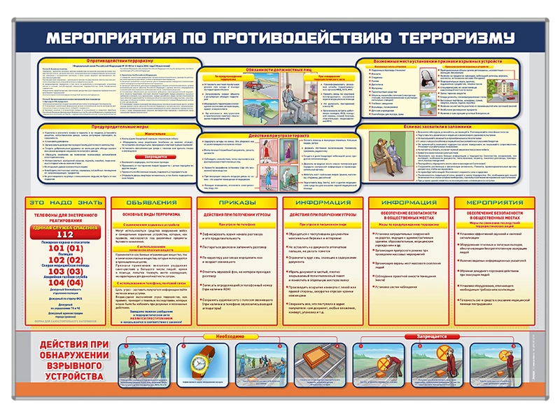 На стенде размещены иллюстрированные рубрики: "О мерах противодействия терроризму", "Предупредительные меры", "Обязанности должностных лиц", "Действия при угрозе теракта", "Возможные места установки и признаки взрывных устройств", "Действия при обнаружении взрывного устройства".