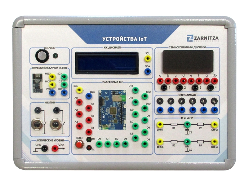Комплект учебно-лабораторного оборудования "Технологии коммуникации в интернете вещей" предназначен для проведения лабораторно-практических работ студентами высших, средних и профессионально-технических образовательных учреждений с целью получения первичных знаний, опыта и навыков работы с концепцией взаимодействия и обмена данными между устройствами интернета вещей (IoT). Модули позволяют получить навыки работы с моноплатным компьютером, микроконтроллером ESP8266, аналоговыми приемниками и передатчиками, цифровыми трансиверами, микросхемой часов реального времени, датчиком температуры с протоколом 1-wire, ЖКИ-дисплеем, светодиодами, кнопками. Навыки программирования устройств IoT на базе отладочной платы Discovery Kit, Internet of Things, а также программирование отладочной платы Arduino Uno с использованием разнообразных периферийных и исполнительных устройств. Блоки могут быть использованы для получения базовых знаний по направлениям "Приемопередающие устройства", "Микроконтроллерные и микропроцессорные системы" и "Цифровая электроника".Комплектация