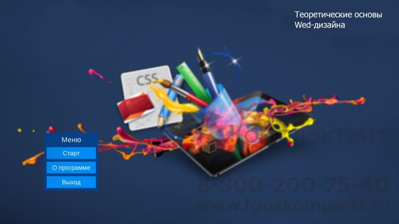 Виртуальный учебник предоставляет основные концепции в данной отрасли веб-разработки, основную теорию графического дизайна, возможность решения задач путем компоновки предоставленных элементов, формирует навыки подбора цветовой схемы.