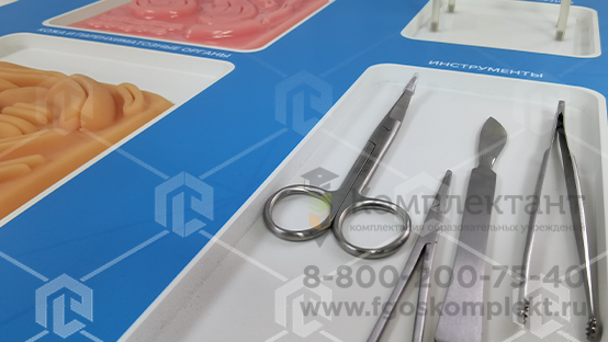 комплект базового хирургического инструмента и материалов для выполнения тренировок.