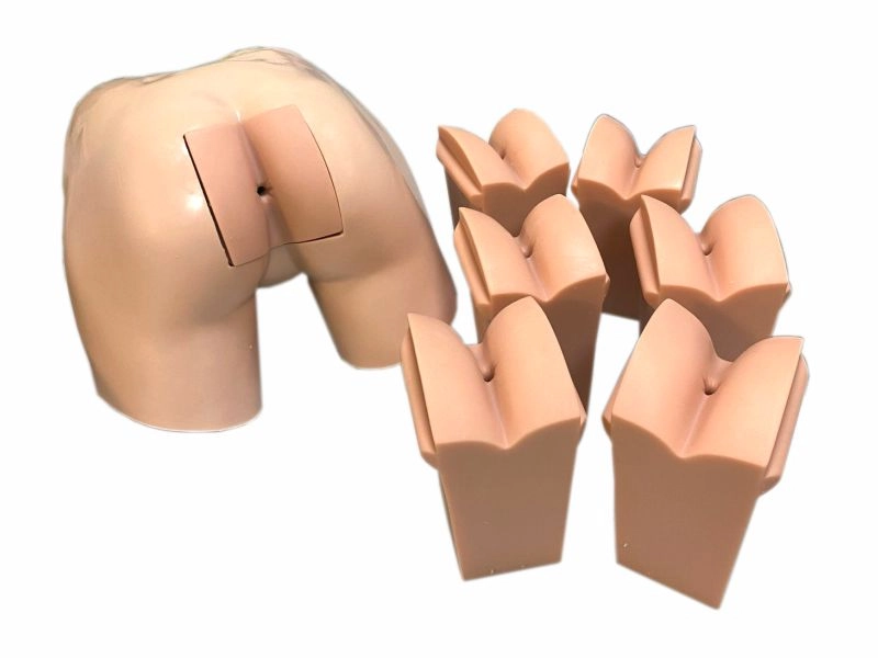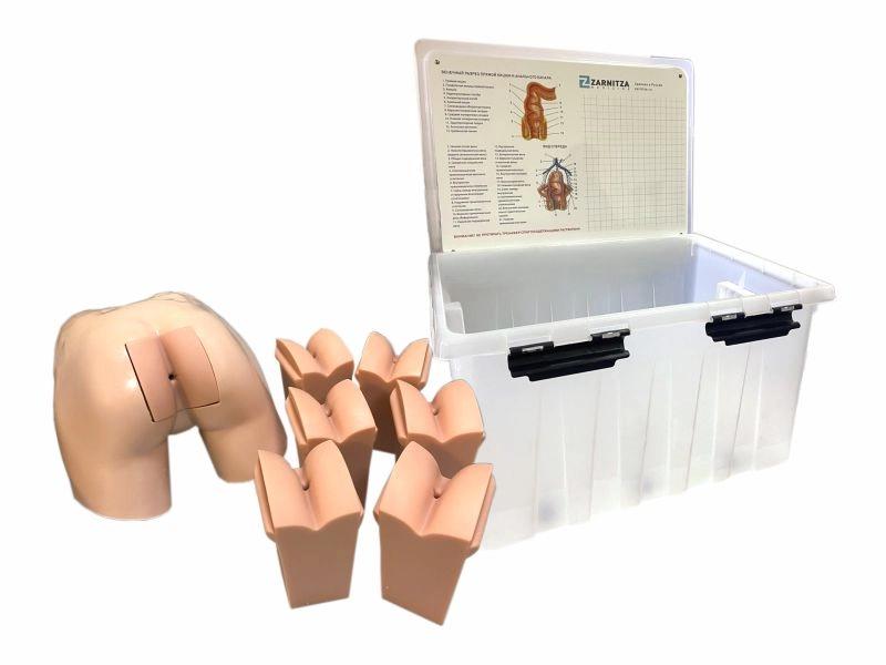 Представляет собой анатомическую модель тазового и частично бедренного отделов тела человека, исходя из общего коленно-локтевого положения. Создан максимальный доступ к ягодичной области и анальному отверстию прямой кишки. Отверстие позволяет проникнуть в полость, повторяющую по размерам и конфигурации просвет прямой кишки человека. Подбор синтетических полимеров позволил воссоздать физиологические значения сокращения наружного сфинктера прямой кишки (800-900 г) и механические свойства стенки органа. Область расположения имитированной прямой кишки находится в пределах съемного блока кубической формы, который надежно удерживается на модели благодаря специальному замку. Тренажер снабжен 7 блоками-вставками (норма, одиночный полип, полипоз, унилатеральная карцинома, карцинома с циркулярным ростом, геморрой, трещина прямой кишки). Тренажер предназначен для обучения навыкам пальцевого ректального обследования и последующего контроля приобретенных умений. Тренажер поставляется с полноцветным маркерным планшетом, на котором представлена анатомическая схема тазобедренного сустава для отработки теоретических навыков ректального обследования и ведения записей, с комплектом цветных маркеров. Для удобства транспортировки и хранения тренажер поставляется в специальном кейсе.
