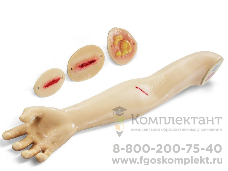 предназначен для отработки навыков наложения и снятия хирургических швов, для чего на предплечье размещена рана. Материал тренажера имитирует мягкие ткани и позволяет многократно повторять процедуру наложения шва. Также фантом комплектуется двумя видами ран: ожог и две различные резаные раны для осуществления манипуляций по уходу.