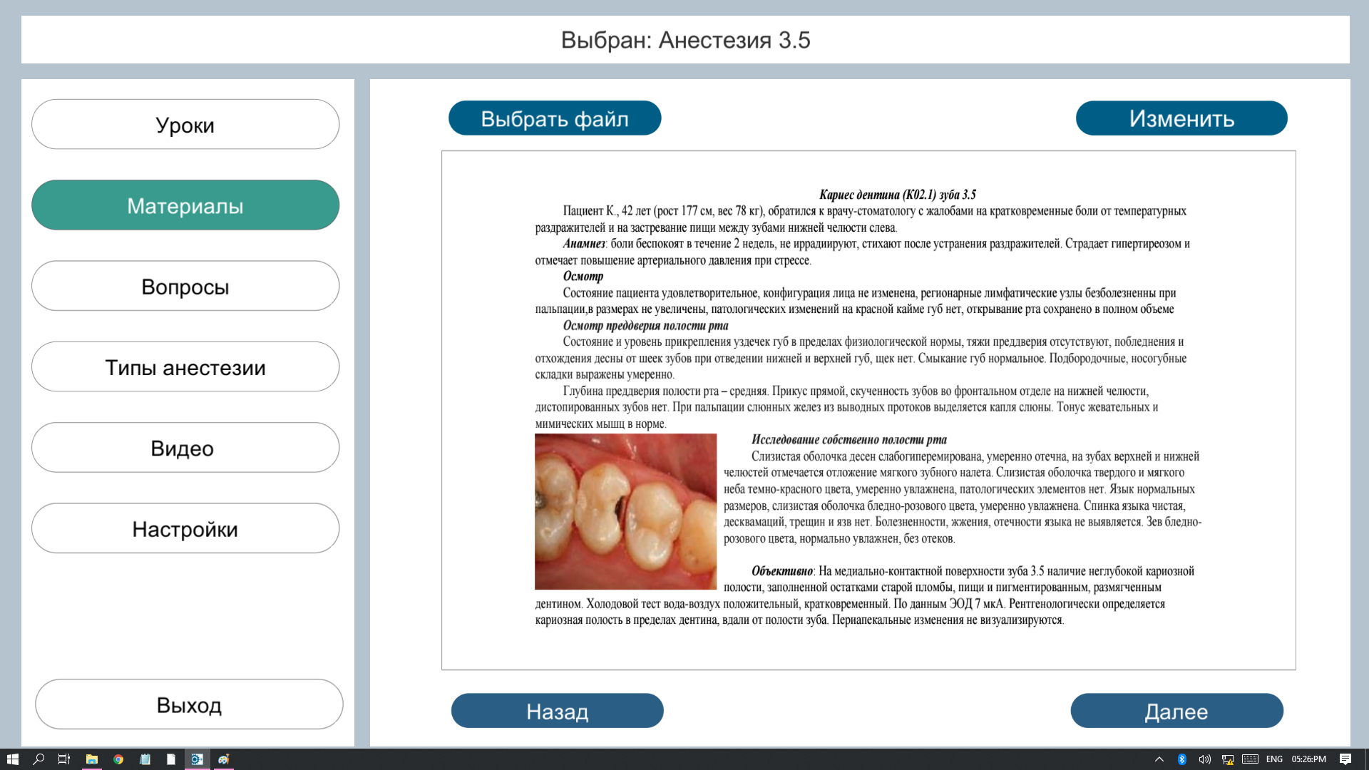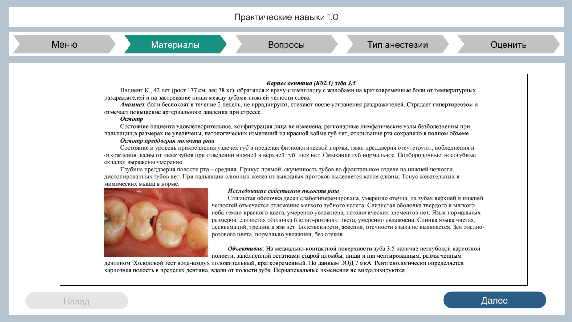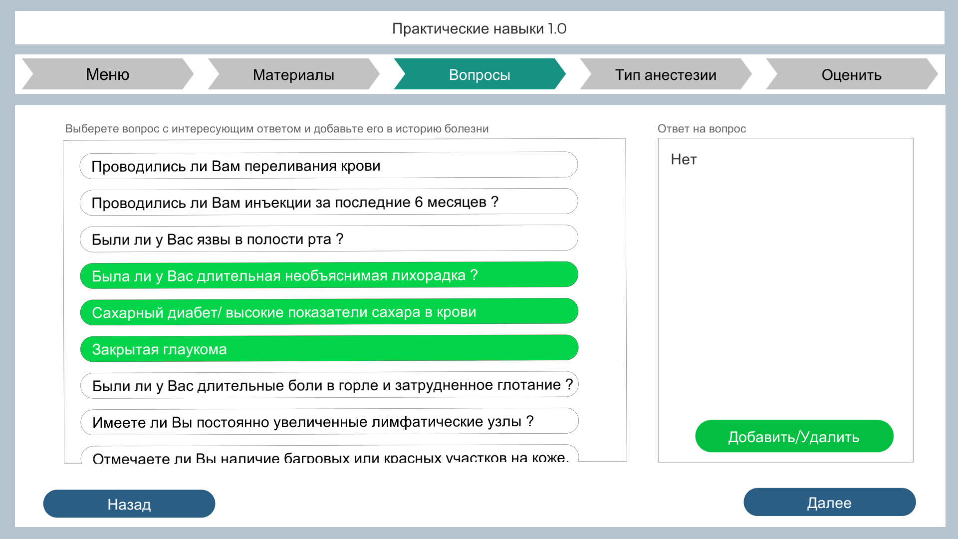 Модуль Анестезия представлен интерактивным опросником, где в режиме «живого» чата обучающийся собирает анамнез у виртуального пациента.