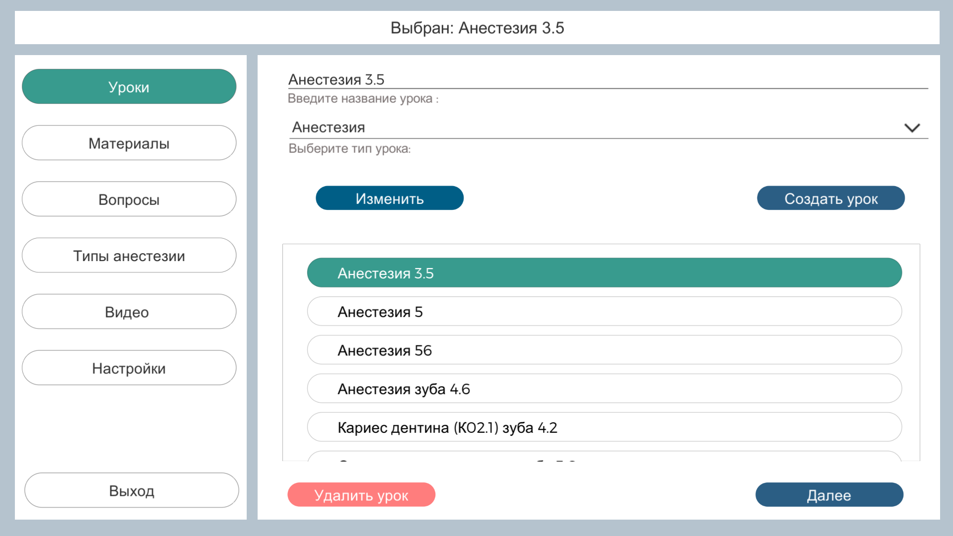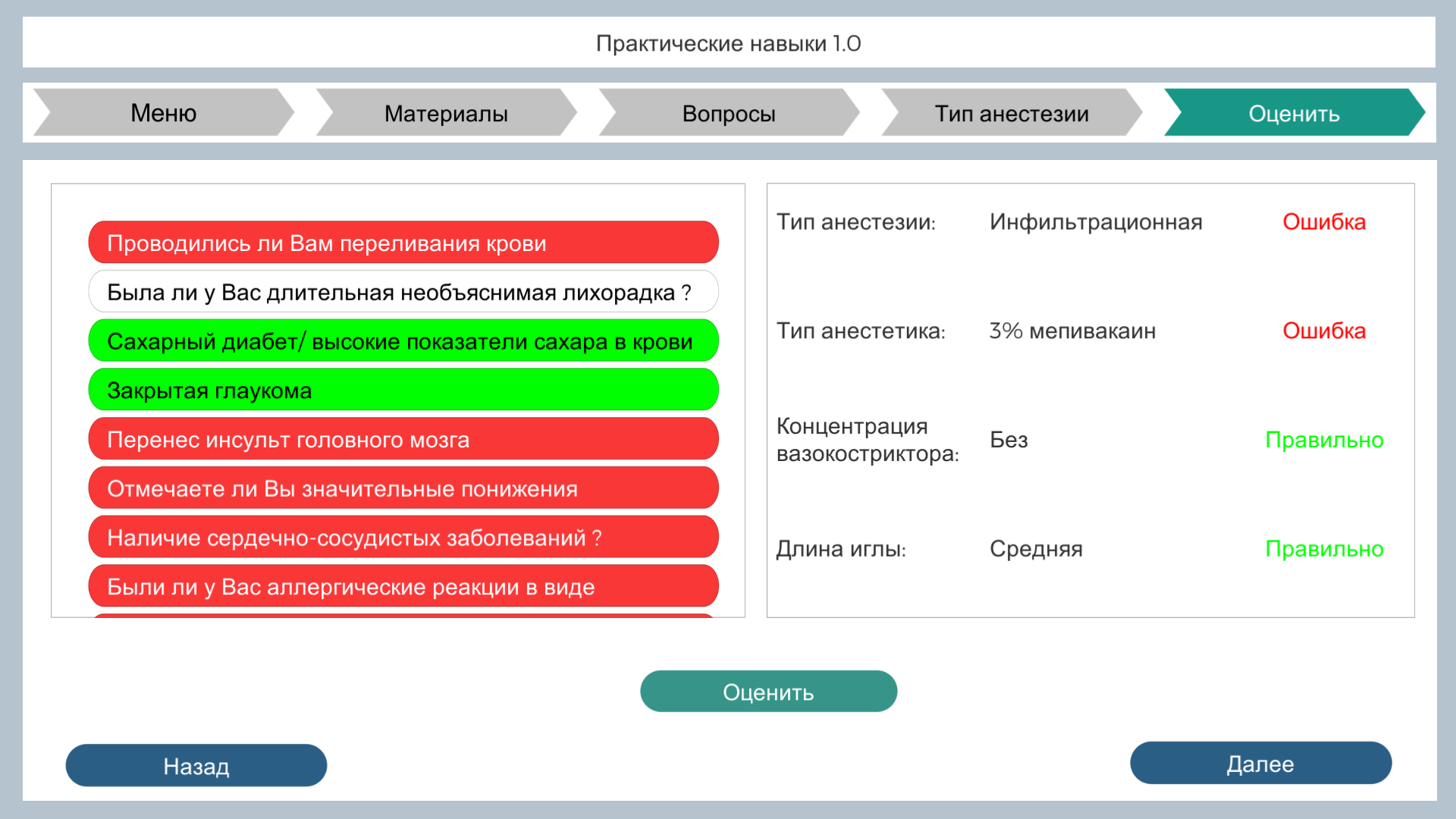 По результатам этого опроса происходит выбор типа анестезии, препарата и т.д., а программное обеспечение оценивает правильность выбора каждого параметра и указывает на ошибки в ходе сбора анамнеза.
