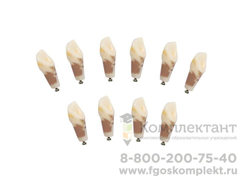Комплект из 10 модельных зубов одного номера естественной формы с винтовым креплением для установки в денто-модель ЧВН-32П. Материал зубов по своим физическим характеристикам максимально приближен к естественным.