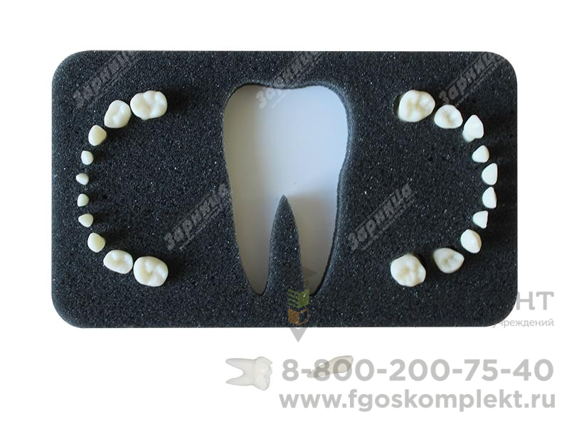 Комплект из 20 временных модельных зубов естественной формы для установки в денто-модели ЧВН-20Э. Материал зубов по своим физическим характеристикам максимально приближен к естественным.