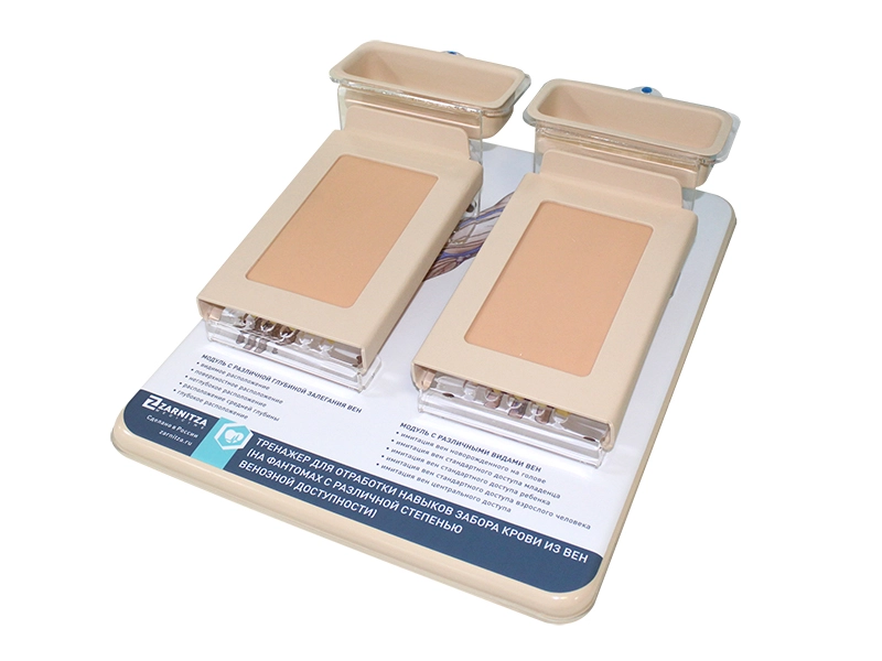 Тренажер представляет собой полноцветную панель с установленными на ней двумя имитаторами участков кожи с подкожной клетчаткой и венами, расположенными на разной глубине и имеющими разный диаметр. Предназначен для отработки навыков внутривенного доступа и забора крови.